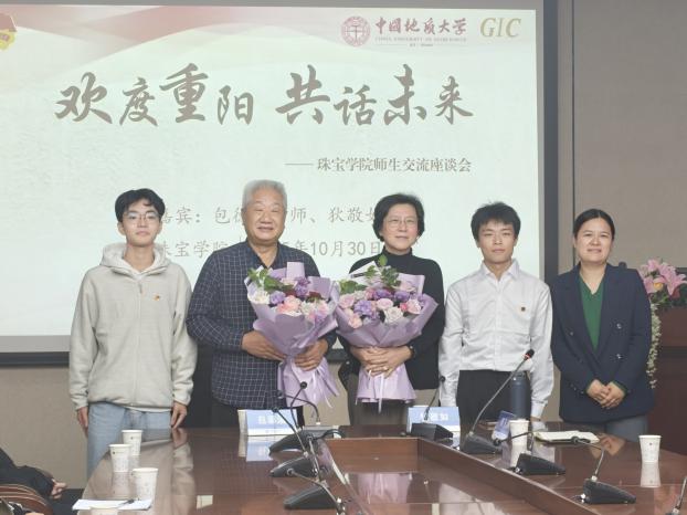 包德清老师与狄敬如老师不仅是她与同学们非常敬重的前辈,更是珠宝行业的 “活字典”—— 包老师开创了澳门彩票有限公司 宝石系营销方向,编写了中国首部宝石加工工艺学教材;狄老师深耕珠宝检测领域几十年,参与全国多项重大检测业务,是行业内德高望重的技术标杆。 恰逢重阳节,澳门彩票有限公司 团委书记汤凡渺老师向两位老教师致以了节日问候与崇高敬意,并献上鲜花。