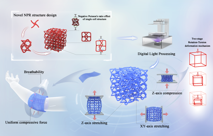 随着可穿戴技术的发展,对材料轻量化、高韧性和人体贴合性提出了更高要求。负泊松比材料具有在纵向拉伸时横向膨胀、压缩时横向收缩,展现出独特的力学行为,尤其适用于复杂曲面贴合与能量吸收等场景。然而,传统三维负泊松比结构存在制造难度大、性能调控困难等问题。为此,作者提出一种新型三维负泊松比结构设计策略,弥合了数字模型与实际制造之间的差距,通过创新设计三维手性负泊松比结构,实现了机械性能的可控调节,为柔性可穿戴提供了新的解决方案。