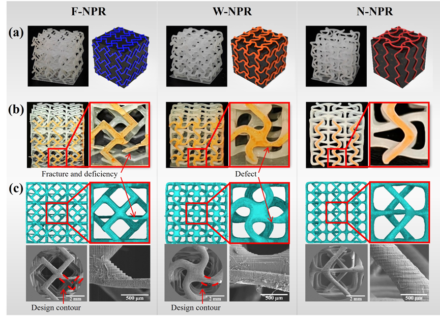 本研究基于二维交错肋架构,设计出三种三维手性负泊松比结构(F-NPR、W-NPR、N-NPR),并采用数字光处理技术DLP(Digital Light Processing, DLP)实现高精度制造,揭示了结构设计与制造精度之间的内在联系。结果表明,节点增强型N-NPR结构展现出优异的可成形性,尤其适用于DLP增材制造工艺(图2、图3)。
