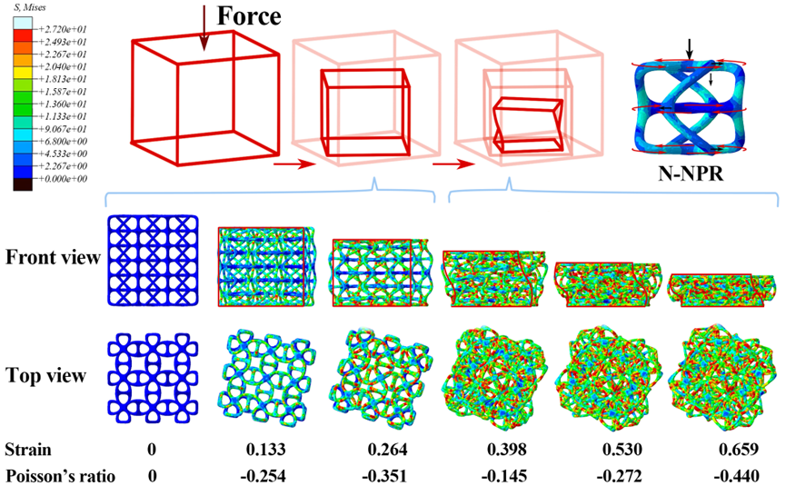 通过有限元模拟与实验验证,研究系统探讨了杆径尺寸与单元尺寸对N-NPR结构力学性能的影响。结果表明,通过调节体积分数,可精准调控N-NPR结构的压缩/拉伸强度、泊松比及能量吸收能力。该结构在压缩与拉伸过程中均表现出显著的负泊松比效应,并在压缩载荷下呈现出独特的两段式旋转-扭转变形机制,提升了材料的设计自由度(图4)。