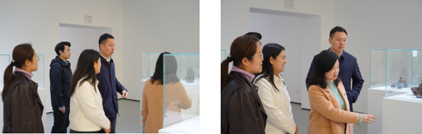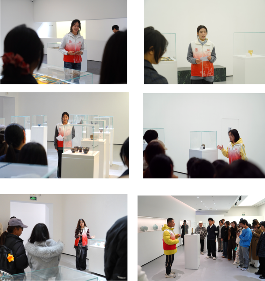 实践学习环节,6名志愿者讲解员带领全体老师同学围绕玉雕、掐丝珐琅、花丝镶嵌、建盏烧制、金镶玉、宫毯织造等各类非遗作品进行参观。志愿者讲解员详细且生动地介绍其工艺技法、历史渊源与文化寓意,让师生在沉浸式体验中深度感受非遗文化的独特魅力。